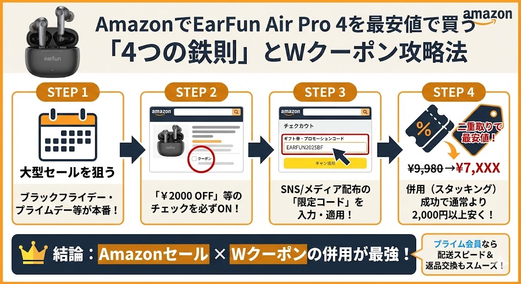 AmazonでEarFun Air Pro 4を最安値で購入するための鉄則は、Amazon独自の「商品ページ内クーポン」と「プロモーションコード」の二重取りを意識することです。