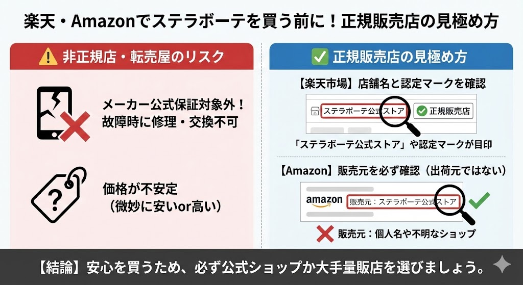 - 楽天やAmazonで買うなら正規販売店を見極める