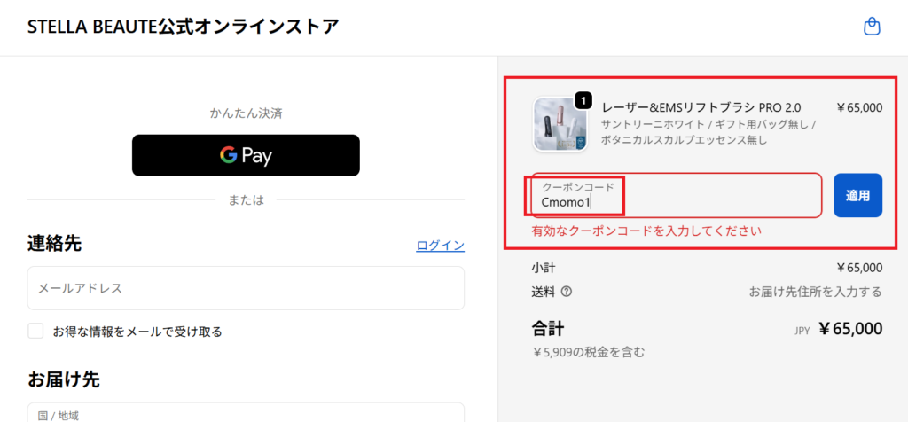 STELLA BEAUTE公式オンラインストアでは購入を進めていくと【クーポンコード入力欄】が出てきます。