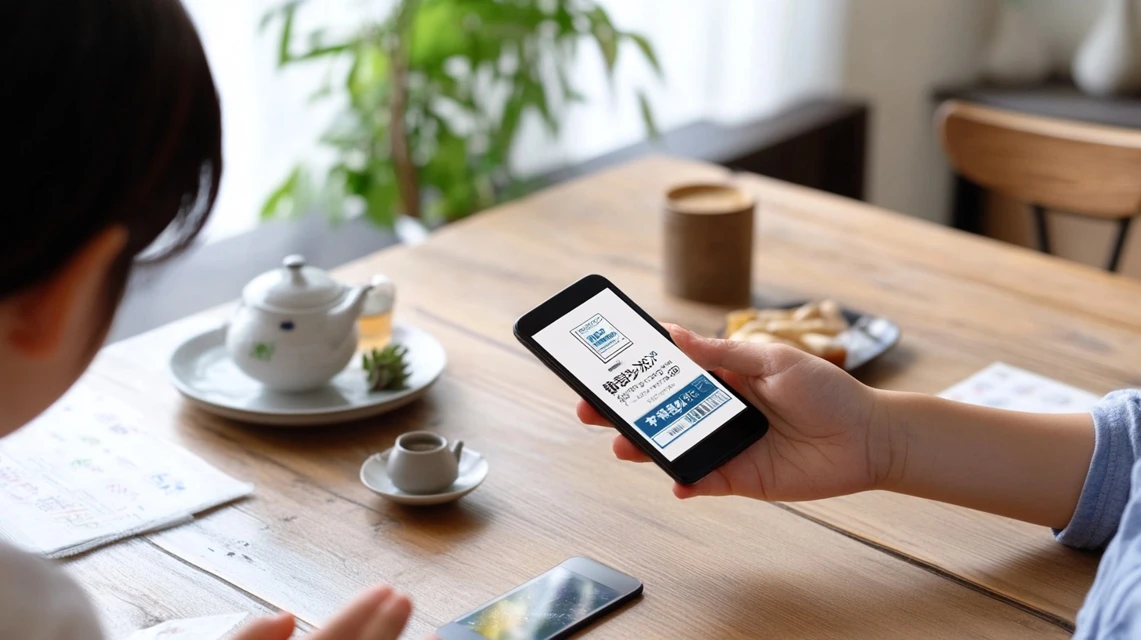 日本人女性が会員アプリの割引クーポンを活用して入場準備