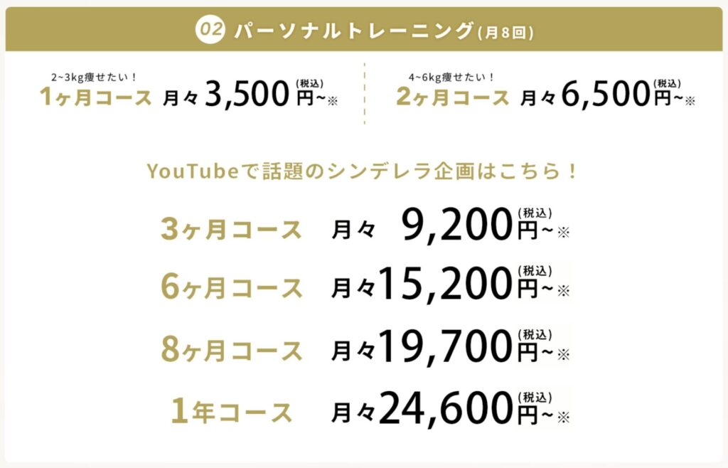 | コース料金 (月8回 / 2ヶ月換算の半額) | 60,000円 〜 150,000円 メイン | トレーナーのランクや個室の有無で変動。 ※食事指導込みの場合が多い |