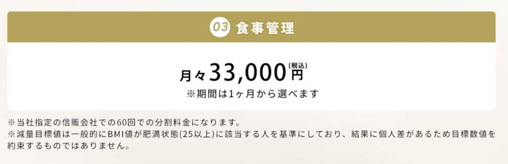 まず理解すべきは、食事管理サポートがコース料金に含まれておらず、月額33,000円(税込)のオプションサービス であるという点です(一部の古い情報 では19,800円/月とあるため、料金改定があった可能性があります)。