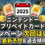 2025年のニンテンドーのプリペイドカードのキャンペーンは、過去の傾向から春のゴールデンウィーク時期に開催される可能性が高いです。